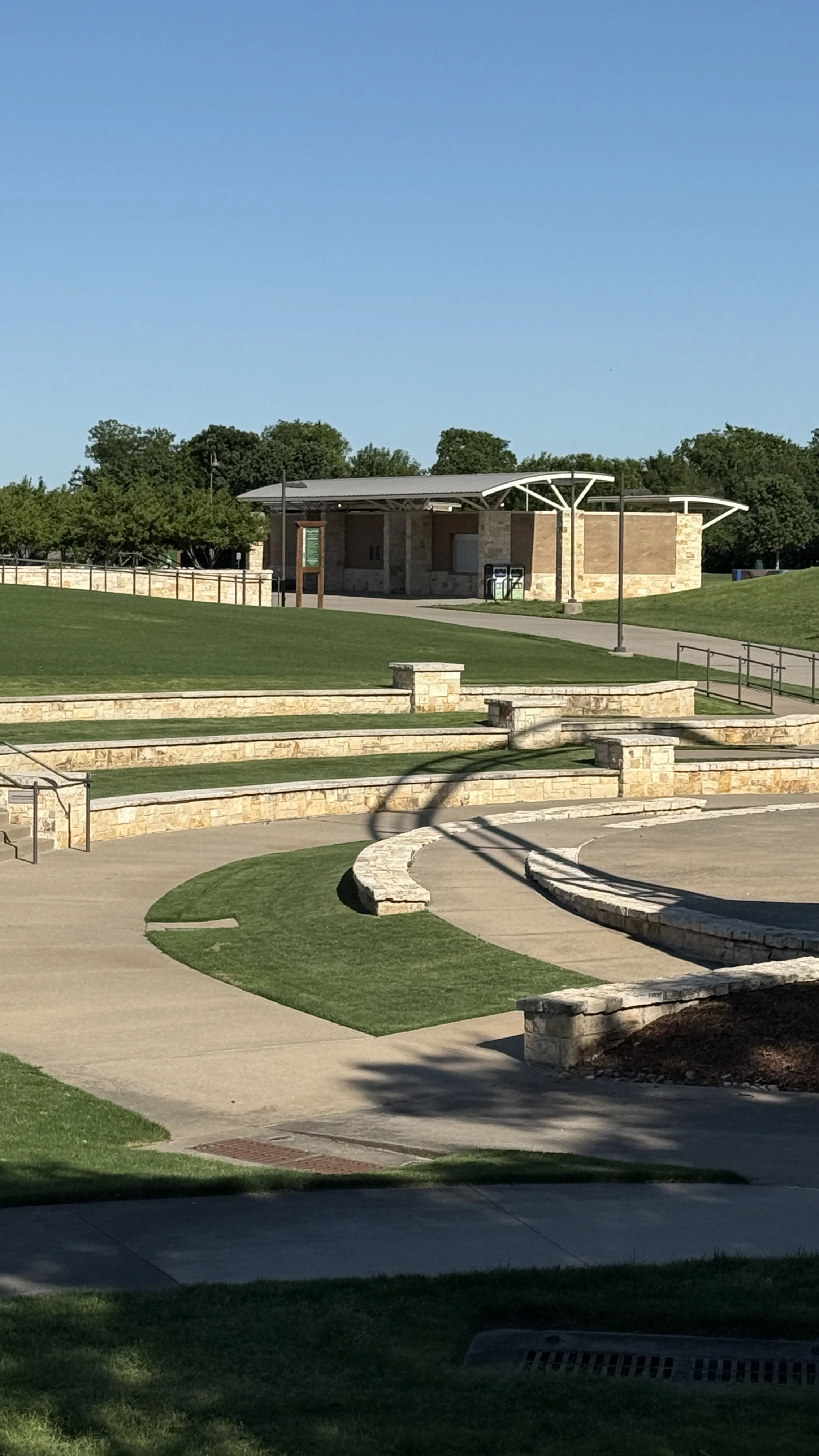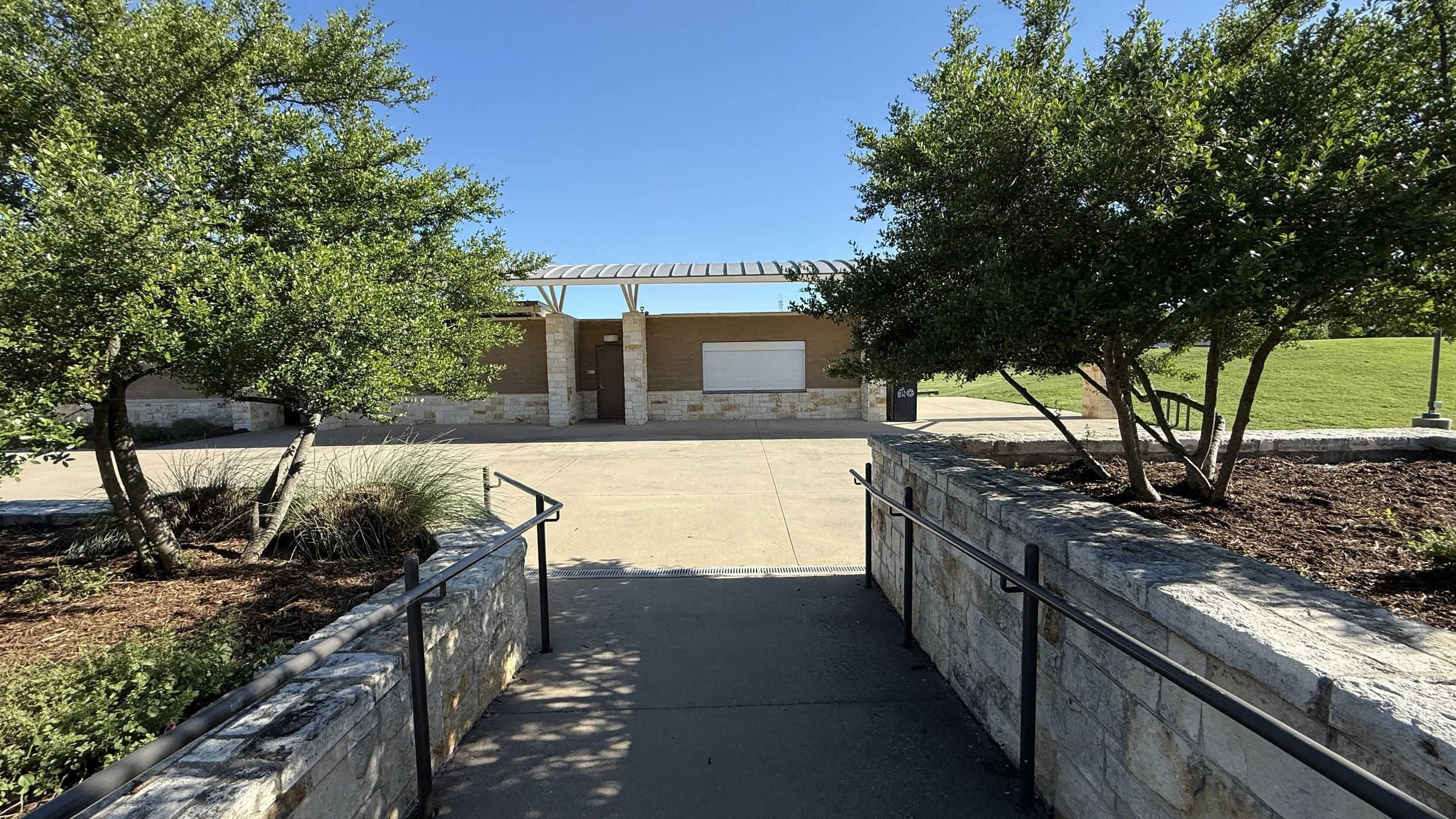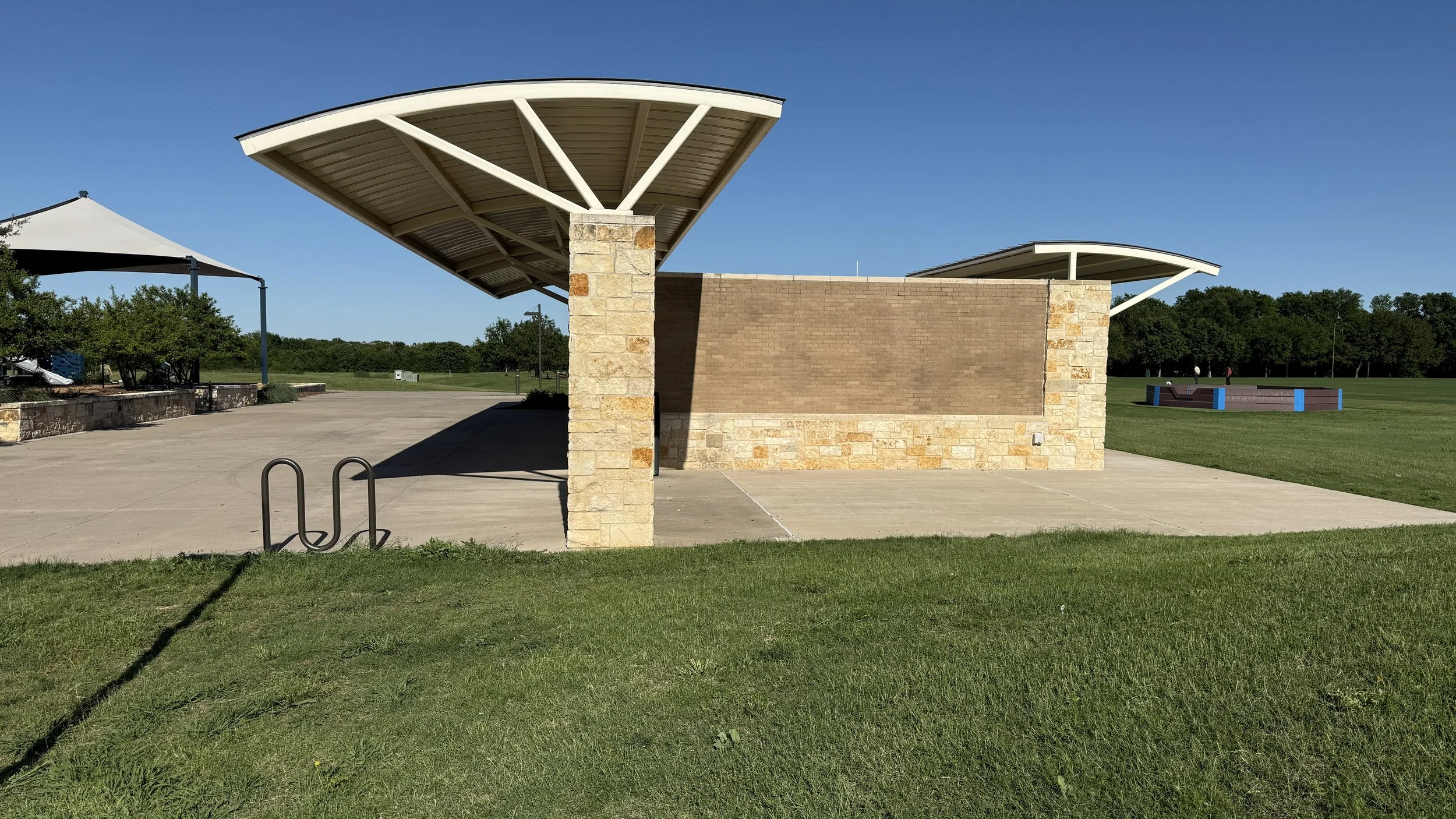 The concession/restroom building was designed to compliment a larger park design that includes an amphitheater, softball fields, trails, a spray ground, and picnic area. The large raised roof provides shade for a plaza and protection for the open air restrooms. Low masonry walls tie the building to other hardscape site elements. The building provides a serving and food prep space for local athletic groups as well as park department storage.